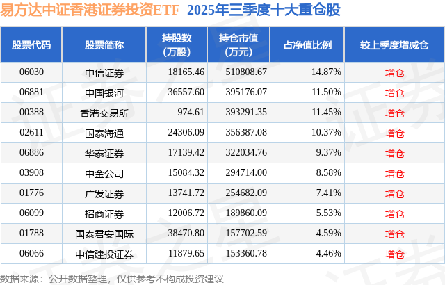从基金规模来看,易方达中证香港证券投资ETF基金2025年三季度公布的基金规模为343.54亿元,较上一期规模97.03亿元变化了246.51亿元,环比变化了254.06%。该基金最新一期资产配置为:股票占净值比98.79%,无债券类资产,现金占净值比1.03%。从基金持仓来看,该基金当季前十大股票仓位达88.13%,第一大重仓股为中信证券(06030),持仓占比为14.87%。