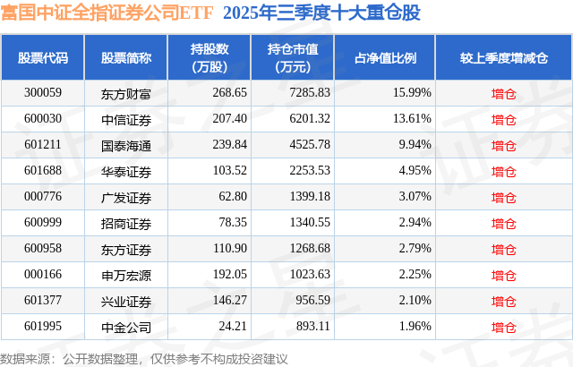 从基金规模来看,富国中证全指证券公司ETF基金2025年三季度公布的基金规模为4.56亿元,较上一期规模2.31亿元变化了2.24亿元,环比变化了96.97%。该基金最新一期资产配置为:股票占净值比99.32%,无债券类资产,现金占净值比1.26%。从基金持仓来看,该基金当季前十大股票仓位达59.6%,第一大重仓股为东方财富(300059),持仓占比为15.99%。