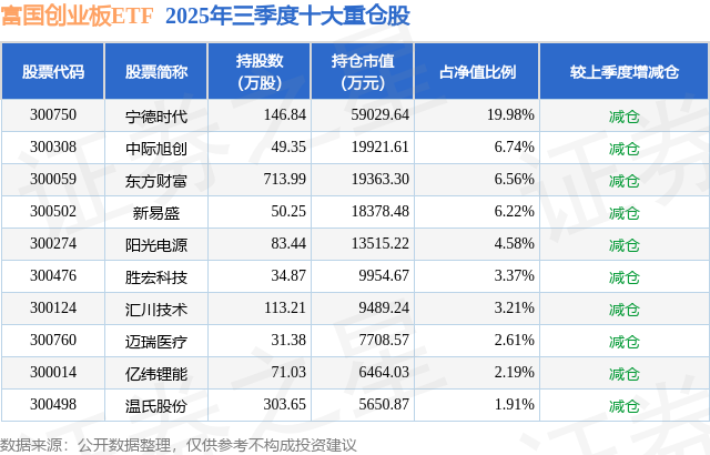 从基金规模来看,富国创业板ETF基金2025年三季度公布的基金规模为29.54亿元,较上一期规模24.74亿元变化了4.8亿元,环比变化了19.42%。该基金最新一期资产配置为:股票占净值比99.75%,无债券类资产,现金占净值比0.47%。从基金持仓来看,该基金当季前十大股票仓位达57.37%,第一大重仓股为宁德时代(300750),持仓占比为19.98%。