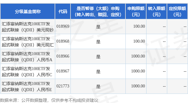 注:1、汇添富纳斯达克100ETF发起式联接(QDII)人民币A、汇添富纳斯达克100ETF发起式联接(QDII)人民币C、汇添富纳斯达克100ETF发起式联接(QDII)人民币E自2025年10月30日起限制大额申购、大额定期定额投资业务,限制金额为5000人民币元,汇添富纳斯达克100ETF发起式联接(QDII)美元现钞、汇添富纳斯达克100ETF发起式联接(QDII)美元现汇自2025年10月30日起限制大额申购、大额定期定额投资业务,限制金额为1000美元,详见本公司于2025年10月29日发布的《关于汇添富纳斯达克100交易型开放式指数证券投资基金发起式联接基金(QDII)调整大额申购、定期定额投资业务限制金额的公告》。
