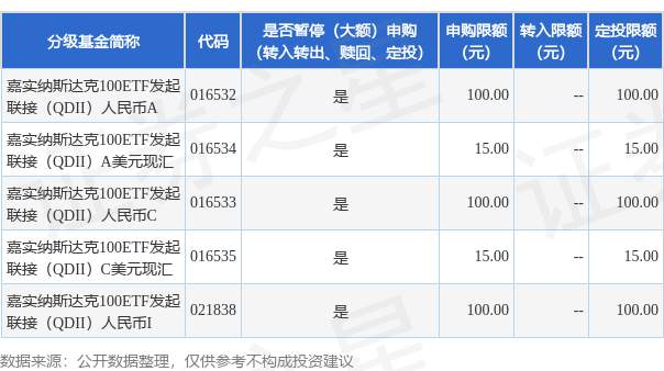 注:嘉实纳斯达克100ETF发起联接(QDII)人民币A、嘉实纳斯达克100ETF发起联接(QDII)人民币C、嘉实纳斯达克100ETF发起联接(QDII)人民币I限制申购金额、限制定期定额投资金额:100元。