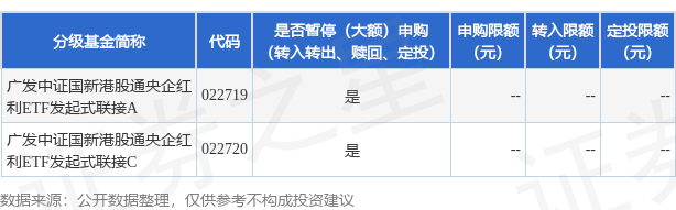 证券之星消息,11月7日广发基金管理有限公司发布《关于广发中证国新港股通央企红利交易型开放式指数证券投资基金发起式联接基金暂停机构投资者大额申购(含转换转入、定期定额和不定额投资)业务的公告》。公告中提示,为保护基金份额持有人利益,自2025年11月7日起广发中证国新港股通央企红利交易型开放式指数证券投资基金发起式联接基金暂停机构投资者大额申购(含转换转入、定期定额和不定额投资)业务,申购、转换转入上限金额为10.0万元,下属分级基金调整明细如下: