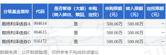 证券之星消息,11月10日鹏扬基金管理有限公司发布《鹏扬利泽债券型证券投资基金暂停大额申购(含转换转入、定期定额投资)业务的公告》。公告中提示,为保证本基金的平稳运作,保护基金份额持有人利益,自2025年11月12日起鹏扬利泽债券型证券投资基金暂停大额申购(含转换转入、定期定额投资)业务,申购、转换转入上限金额为500.0万元,下属分级基金调整明细如下: