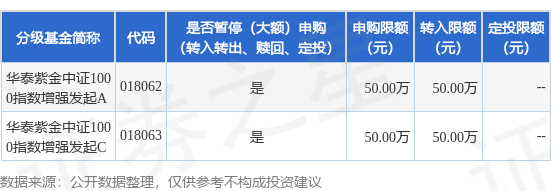 注:为维护基金份额持有人的利益,华泰证券(上海)资产管理有限公司(以下简称“本公司”)决定自2025年11月12日单日每个基金账户累计申购、定期定额申购及转换转入华泰紫金中证1000指数增强型发起式证券投资基金各类份额合计金额分别不超过人民币50万元,若超过上述金额,本公司有权部分或全部拒绝该笔申购申请。本基金限制大额申购业务期间,本公司将正常办理本基金的赎回业务。本基金恢复办理大额申购业务的具体时间将另行公告。