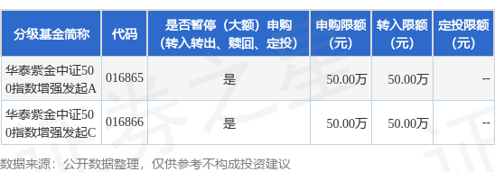 注:为维护基金份额持有人的利益,华泰证券(上海)资产管理有限公司(以下简称“本公司”)决定自2025年11月12日单日每个基金账户累计申购、定期定额申购及转换转入华泰紫金中证500指数增强型发起式证券投资基金各类份额合计金额分别不超过人民币50万元,若超过上述金额,本公司有权部分或全部拒绝该笔申购申请。本基金限制大额申购业务期间,本公司将正常办理本基金的赎回业务。本基金恢复办理大额申购业务的具体时间将另行公告。