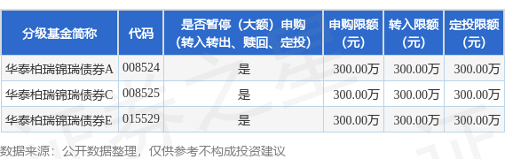 证券之星消息,11月12日华泰柏瑞基金管理有限公司发布《华泰柏瑞锦瑞债券型证券投资基金暂停大额申购(含转换转入、定期定额投资)业务的公告》。公告中提示,为保证本基金的稳定运作,保护基金份额持有人利益,自2025年11月12日起华泰柏瑞锦瑞债券型证券投资基金暂停大额申购(含转换转入、定期定额投资)业务,申购、转换转入上限金额为300.0万元,下属分级基金调整明细如下: