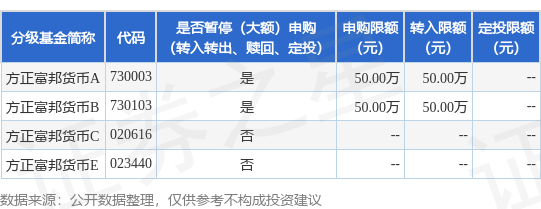 证券之星消息,11月12日方正富邦基金管理有限公司发布《方正富邦货币市场基金A类份额和B类份额调整代销渠道大额申购(转换转入、定期定额投资)业务的公告》。公告中提示,为了保证基金的平稳运作,保护基金份额持有人的利益,自2025年11月13日起,方正富邦货币市场基金A类份额和B类份额暂停代销渠道大额申购(含转换转入、定期定额投资)业务,自2025年11月13日起方正富邦货币市场基金A类份额和B类份额调整代销渠道大额申购(转换转入、定期定额投资)业务,申购、转换转入上限金额为50.0万元,下属分级基金调整明细如下: