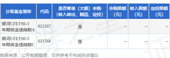 注:1)银河基金管理有限公司(以下简称“本公司”)决定自2025年11月14日起限制银河CFETS0-3年期政策性金融债指数证券投资基金(以下简称“本基金”)申购、转换转入、定期定额投资业务的金额;即如单日单个基金账户对本基金A类、C类申购、转换转入、定期定额申请金额大于100万元,则100万元确认申购成功,超过100万元(不含)金额的部分将确认失败;如单日单个基金账户多笔累计申购金额大于100万元,按申请金额从大到小排序,本公司将逐笔累加至100万元的申请确认成功,其余超出部分的申请金额本公司有权确认失败。