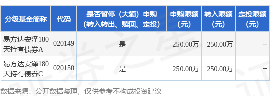 注:根据法律法规和基金合同的相关规定,易方达基金管理有限公司决定自2025年11月18日起,易方达安泽180天持有期债券型证券投资基金(以下简称“本基金”)A类基金份额和C类基金份额在直销中心暂停机构客户的大额申购及大额转换转入业务,单日单个基金账户在直销中心累计申购(含转换转入,下同)本基金A类基金份额或C类基金份额的金额不超过250万元(含)。如单日单个基金账户单笔申购本基金A类基金份额或C类基金份额的金额超过250万元(不含),则250万元确认申购成功,超过250万元(不含)金额的部分将确认失败;如单日单个基金账户多笔累计申购本基金A类基金份额的金额超过250万元(不含)或单日单个基金账户多笔累计申购本基金C类基金份额的金额超过250万元(不含),则对该类基金份额的申请按照申请金额从大到小排序,基金管理人将逐笔累加至该类基金份额不超过250万元(含)限额的申请确认成功,该类基金份额其余申请金额确认失败。