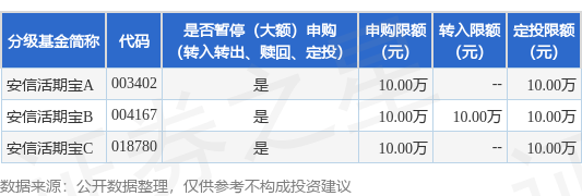 注:1、安信活期宝货币市场基金(以下简称“本基金”)限制北京济安基金销售有限公司单一账户最高持有金额为不超过10万元(含10万元),限制单日申购、转换转入及定期定额投资的金额为不超过10万元(含10万元),本基金下属分级基金A、C暂未开通转换业务。
