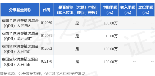 证券之星消息,11月20日富国基金管理有限公司发布《关于富国全球消费精选混合型证券投资基金(QDII)暂停大额申购及定期定额投资业务的公告》。公告中提示,为了保证基金的平稳运作,保护基金持有人的利益,自2025年11月21日起富国全球消费精选混合型证券投资基金(QDII)暂停大额申购及定期定额投资业务,下属分级基金调整明细如下: