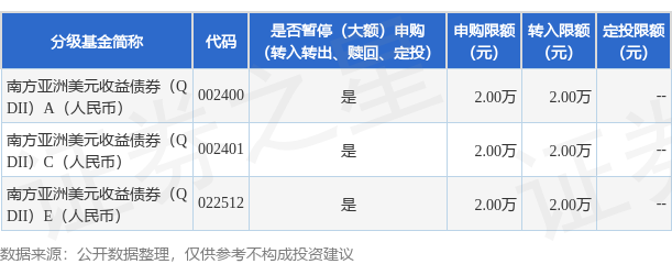 证券之星消息,11月20日南方基金管理股份有限公司发布《关于调整南方亚洲美元收益债券型证券投资基金申购、定投及转换转入业务金额限制的公告》。公告中提示,为保护基金份额持有人的利益,自2025年11月20日起调整南方亚洲美元收益债券型证券投资基金申购、定投及转换转入业务金额限制,申购、转换转入上限金额为2.0万元,下属分级基金调整明细如下: