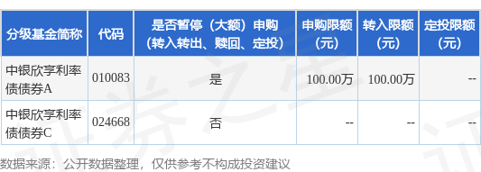 注:注:本基金C类基金份额的申购、定期定额投资限制金额仍适用于基金管理人2025年7月8日刊登的《关于中银欣享利率债债券型证券投资基金暂停大额申购及定期定额投资业务的公告》。
