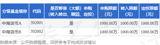 证券之星消息,11月25日中海基金管理有限公司发布《中海货币市场证券投资基金暂停代销机构大额申购(含大额转换转入、定期定额投资)业务公告》。公告中提示,为维护现有基金份额持有人的利益,保证基金的平稳运行,自2025年11月26日起中海货币市场证券投资基金暂停代销机构大额申购(含大额转换转入、定期定额投资)业务,申购、转换转入上限金额为1000.0万元,下属分级基金调整明细如下: