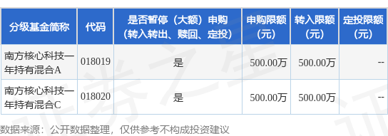 证券之星消息,11月25日南方基金管理股份有限公司发布《关于南方核心科技一年持有期混合型证券投资基金限制大额申购、定投和转换转入业务的公告》。公告中提示,为保护基金份额持有人的利益,自2025年11月25日起南方核心科技一年持有期混合型证券投资基金限制大额申购、定投和转换转入业务,申购、转换转入上限金额为500.0万元,下属分级基金调整明细如下: