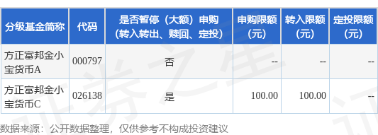 证券之星消息,11月26日方正富邦基金管理有限公司发布《方正富邦金小宝货币市场证券投资基金C类份额调整大额申购(转换转入、定期定额投资)业务的公告》。公告中提示,为了保证基金的平稳运作,保护基金份额持有人的利益,自2025年11月27日起,方正富邦金小宝货币市场证券投资基金C类份额暂停大额申购(含转换转入、定期定额投资)业务,自2025年11月27日起方正富邦金小宝货币市场证券投资基金C类份额调整大额申购(转换转入、定期定额投资)业务,申购、转换转入上限金额为0.01万元,下属分级基金调整明细如下: