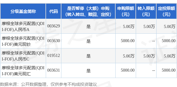 证券之星消息,11月28日摩根基金管理(中国)有限公司发布《摩根全球多元配置证券投资基金(QDII-FOF)调整大额申购、定期定额投资及转换转入业务的公告》。公告中提示,为保证本基金的稳定运作,保护基金份额持有人利益,自2025年12月1日起摩根全球多元配置证券投资基金(QDII-FOF)调整大额申购、定期定额投资及转换转入业务,下属分级基金调整明细如下: