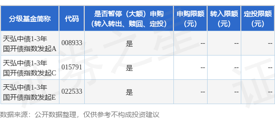 证券之星消息,11月28日天弘基金管理有限公司发布《天弘基金管理有限公司关于天弘中债1-3年国开行债券指数发起式证券投资基金暂停机构投资者大额申购、转换转入及定期定额投资业务的公告》。公告中提示,为了保证基金的平稳运作,保护基金份额持有人利益,自2025年11月28日起天弘基金管理有限公司关于天弘中债1-3年国开行债券指数发起式证券投资基金暂停机构投资者大额申购、转换转入及定期定额投资业务,申购、转换转入、定投上限金额为500.0万元,下属分级基金调整明细如下: