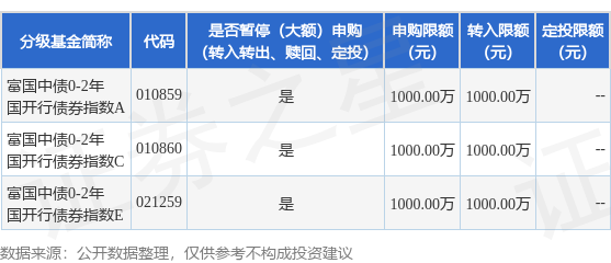证券之星消息,11月29日富国基金管理有限公司发布《关于富国中债0-2年国开行债券指数证券投资基金暂停大额申购、转换转入及定期定额投资业务的公告》。公告中提示,为了保证基金的平稳运作,保护基金持有人的利益,自2025年12月1日起富国中债0-2年国开行债券指数证券投资基金暂停大额申购、转换转入及定期定额投资业务,下属分级基金调整明细如下:
