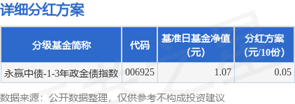 证券之星消息,12月2日发布《永赢中债-1-3年政策性金融债指数证券投资基金分红公告》。本次分红为本基金2025年度的第3次分红。公告显示,本次分红的收益分配基准日为11月11日,详细分红方案如下: