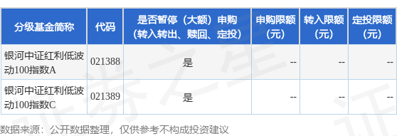 注:1)银河基金管理有限公司(以下简称“本公司”)决定自2025年12月3日起限制银河中证红利低波动100指数证券投资基金(以下简称“本基金”)申购、转换转入、定期定额投资业务的金额;即如单日单个基金账户对本基金A类、C类申购、转换转入、定期定额申请金额大于100万元,则100万元确认申购成功,超过100万元(不含)金额的部分将确认失败;如单日单个基金账户多笔累计申购金额大于100万元,按申请金额从大到小排序,本公司将逐笔累加至100万元的申请确认成功,其余超出部分的申请金额本公司有权确认失败。