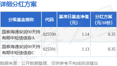 证券之星消息,12月4日发布《国泰海通安润90天持有期中短债债券型证券投资基金分红公告》。2025年第一次分红。公告显示,本次分红的收益分配基准日为11月11日,详细分红方案如下: