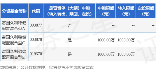 证券之星消息,12月4日富国基金管理有限公司发布《关于富国久利稳健配置混合型证券投资基金(C、E类份额)暂停大额申购、转换转入及定期定额投资业务的公告》。公告中提示,为了保证基金的平稳运作,保护基金持有人的利益,自2025年12月5日起富国久利稳健配置混合型证券投资基金(C、E类份额)暂停大额申购、转换转入及定期定额投资业务,下属分级基金调整明细如下: