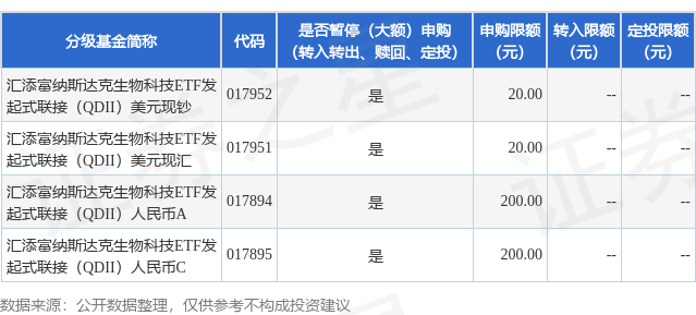 注:1、汇添富纳斯达克生物科技ETF发起式联接(QDII)人民币A、汇添富纳斯达克生物科技ETF发起式联接(QDII)人民币C自2025年11月05日起限制大额申购、大额定期定额投资业务,限制金额为1000人民币元,汇添富纳斯达克生物科技ETF发起式联接(QDII)美元现钞、汇添富纳斯达克生物科技ETF发起式联接(QDII)美元现汇自2025年11月05日起限制大额申购、大额定期定额投资业务,限制金额为100美元,详见本公司于2025年11月04日发布的《关于汇添富纳斯达克生物科技交易型开放式指数证券投资基金发起式联接基金(QDII)调整大额申购、定期定额投资业务限制金额的公告》。