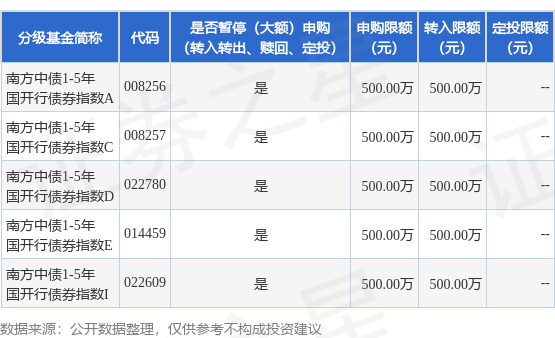 证券之星消息,12月9日南方基金管理股份有限公司发布《南方中债1-5年国开行债券指数证券投资基金限制大额申购、定投和转换转入业务的公告》。公告中提示,为保护基金份额持有人的利益,自2025年12月9日起南方中债1-5年国开行债券指数证券投资基金限制大额申购、定投和转换转入业务,申购、转换转入上限金额为500.0万元,下属分级基金调整明细如下: