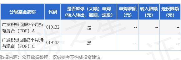 证券之星消息,12月9日广发基金管理有限公司发布《关于广发积极回报3个月持有期混合型基金中基金(FOF)暂停机构投资者大额申购(含定期定额和不定额投资)业务的公告》。公告中提示,为保护基金份额持有人利益,自2025年12月9日起广发积极回报3个月持有期混合型基金中基金(FOF)暂停机构投资者大额申购(含定期定额和不定额投资)业务,申购上限金额为10.0万元,下属分级基金调整明细如下: