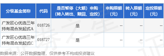 证券之星消息,12月10日广发基金管理有限公司发布《关于广发匠心优选三年持有期混合型发起式证券投资基金暂停机构投资者大额申购(含转换转入、定期定额和不定额投资)业务的公告》。公告中提示,为保护基金份额持有人利益,自2025年12月10日起广发匠心优选三年持有期混合型发起式证券投资基金暂停机构投资者大额申购(含转换转入、定期定额和不定额投资)业务,申购、转换转入上限金额为10.0万元,下属分级基金调整明细如下: