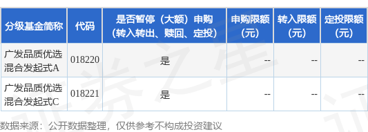 证券之星消息,12月10日广发基金管理有限公司发布《关于广发品质优选混合型发起式证券投资基金暂停机构投资者大额申购(含转换转入、定期定额和不定额投资)业务的公告》。公告中提示,为保护基金份额持有人利益,自2025年12月10日起广发品质优选混合型发起式证券投资基金暂停机构投资者大额申购(含转换转入、定期定额和不定额投资)业务,申购、转换转入上限金额为10.0万元,下属分级基金调整明细如下: