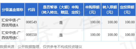 证券之星消息,12月10日汇安基金管理有限责任公司发布《汇安中债-广西壮族自治区公司信用类债券指数证券投资基金暂停大额申购(含转换转入及定期定额投资)业务的公告》。公告中提示,为了保证基金的平稳运作,保护基金份额持有人的利益,自2025年12月10日起汇安中债-广西壮族自治区公司信用类债券指数证券投资基金暂停大额申购(含转换转入及定期定额投资)业务,申购、转换转入、定投上限金额为0.01万元,下属分级基金调整明细如下:
