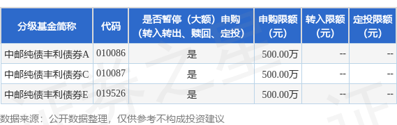 证券之星消息,12月12日中邮创业基金管理股份有限公司发布《中邮纯债丰利债券型证券投资基金暂停大额申购业务公告》。公告中提示,为保护本基金现有份额持有人利益,自2025年12月12日起中邮纯债丰利债券型证券投资基金暂停大额申购业务,申购上限金额为500.0万元,下属分级基金调整明细如下: