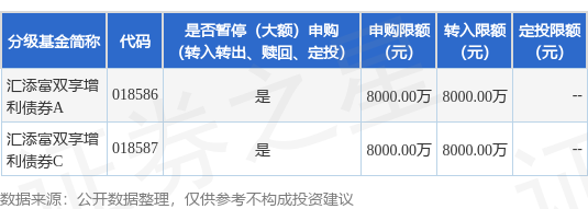 注:1、自2025年12月15日起(含2025年12月15日),汇添富双享增利债券A暂停大额申购、大额转换转入、大额定期定额投资业务,单日单个基金账户单笔或多笔累计申购、转换转入、定期定额投资的金额不应超过80000000人民币元(含80000000人民币元)。当单日某基金账户单笔或多笔累计申购、转换转入、定期定额投资该份额的金额超过80000000人民币元,本公司将部分或全部拒绝。该份额暂停上述大额业务期间,其他业务仍照常办理。自2025年12月23日起,本基金汇添富双享增利债券A将恢复办理大额申购、大额转换转入、大额定期定额投资业务,届时将不再另行公告。