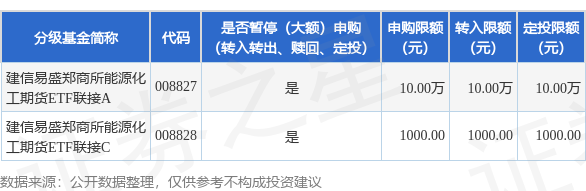 证券之星消息,12月15日建信基金管理有限责任公司发布《建信易盛郑商所能源化工期货交易型开放式指数证券投资基金发起式联接基金暂停大额申购、大额转换转入、定期定额投资公告》。公告中提示,为保护投资者利益,自2025年12月16日起建信易盛郑商所能源化工期货交易型开放式指数证券投资基金发起式联接基金暂停大额申购、大额转换转入、定期定额投资,下属分级基金调整明细如下: