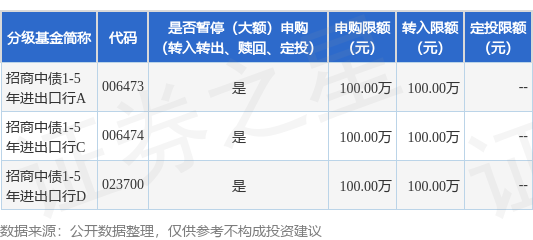 证券之星消息,12月18日招商基金管理有限公司发布《关于暂停招商中债1-5年进出口行债券指数证券投资基金大额申购(含定期定额投资)和转换转入业务的公告》。公告中提示,为保障基金的平稳运作,维护基金份额持有人利益,自2025年12月18日起暂停招商中债1-5年进出口行债券指数证券投资基金大额申购(含定期定额投资)和转换转入业务,申购、转换转入上限金额为100.0万元,下属分级基金调整明细如下: