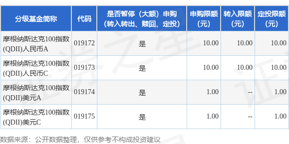 证券之星消息,12月18日摩根基金管理(中国)有限公司发布《摩根纳斯达克100指数型发起式证券投资基金(QDII)调整大额申购、定期定额投资及转换转入业务的公告》。公告中提示,为保证本基金的稳定运作,保护基金份额持有人利益,自2025年12月18日起摩根纳斯达克100指数型发起式证券投资基金(QDII)调整大额申购、定期定额投资及转换转入业务,下属分级基金调整明细如下: