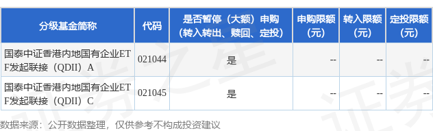 证券之星消息,12月19日国泰基金管理有限公司发布《国泰中证香港内地国有企业交易型开放式指数证券投资基金发起式联接基金(QDII)暂停申购、赎回、定期定额投资业务的公告》。公告中提示,为根据中国创盈市场服务有限公司《关于2024年底及2025年深港通下的港股通交易日有关安排的通知》等的安排,为维护基金份额持有人的利益,保障基金平稳运作,自2025年12月24日起国泰中证香港内地国有企业交易型开放式指数证券投资基金发起式联接基金(QDII)暂停申购、赎回、定期定额投资业务,下属分级基金调整明细如下: