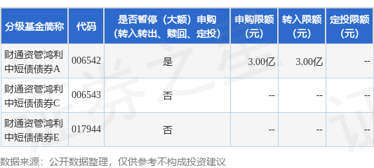注:(1)根据法律法规和基金合同的相关规定,自2025年12月22日起,财通证券资产管理有限公司(以下简称“本公司”)将调整财通资管鸿利中短债债券型证券投资基金(以下简称“本基金”)A类份额在“平安银行股份有限公司”的大额申购(含转换转入、定期定额投资)业务。届时起,若单日单个基金账户的单笔申购(含转换转入、定期定额投资)金额超过人民币3亿元(不含)的,本公司将有权对超过3亿元的部分予以拒绝。若单日单个基金账户多笔累计申购(含转换转入、定期定额投资)金额超过人民币3亿元的,则对申请按照申请金额从大到小排序,逐笔累加至符合不超过人民币3亿元(含)限额的申请确认成功,对超过3亿元的部分及其余笔数本公司将有权予以拒绝。