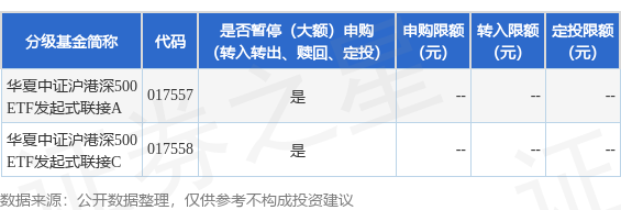 证券之星消息,12月22日华夏基金管理有限公司发布《华夏中证沪港深500交易型开放式指数证券投资基金发起式联接基金暂停申购、转换转入及定期定额申购业务的公告》。公告中提示,为保护投资者利益,自2025年12月22日起华夏中证沪港深500交易型开放式指数证券投资基金发起式联接基金暂停申购、转换转入及定期定额申购业务,下属分级基金调整明细如下: