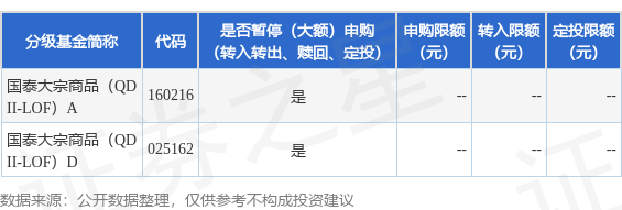 证券之星消息,12月22日国泰基金管理有限公司发布《国泰大宗商品配置证券投资基金(LOF)暂停申购、定期定额投资及赎回业务的公告》。公告中提示,为根据本基金境外主要投资市场节假日休市安排,维护基金份额持有人的利益,保障基金平稳运作,自2025年12月25日起国泰大宗商品配置证券投资基金(LOF)暂停申购、定期定额投资及赎回业务,下属分级基金调整明细如下: