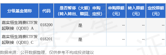 证券之星消息,12月22日嘉实基金管理有限公司发布《关于嘉实恒生消费交易型开放式指数证券投资基金发起式联接基金(QDII)2025年12月24日至12月26日暂停申购、赎回及定期定额投资业务的公告》。公告中提示,为2025年12月24日香港交易所休市半日;2025年12月25日、12月26日香港交易所休市,自2025年12月24日起嘉实恒生消费交易型开放式指数证券投资基金发起式联接基金(QDII)2025年12月24日至12月26日暂停申购、赎回及定期定额投资业务,下属分级基金调整明细如下: