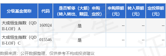 证券之星消息,12月23日大成基金管理有限公司发布《大成恒生指数证券投资基金(LOF)暂停申购、赎回及定投业务的公告》。公告中提示,为2025年12月25日至2025年12月28日为中国香港节假日,自2025年12月25日起大成恒生指数证券投资基金(LOF)暂停申购、赎回及定投业务,下属分级基金调整明细如下:
