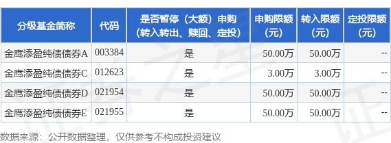 (4)根据2025年11月4日发布的《金鹰基金管理有限公司关于金鹰添盈纯债债券型证券投资基金C类份额暂停大额申购(含转换转入、定期定额投资)的公告》,暂停金鹰添盈纯债债券C在全部销售机构单日单个基金账户累计超过3万元(不含)的申购、定投以及涉及本基金作为转入方的基金转换转入业务,该公告限制大额申购条款不变。