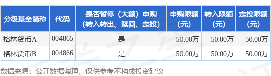 证券之星消息,12月25日格林基金管理有限公司发布《格林日鑫月熠货币市场基金暂停部分代销机构大额申购、定期定额投资与转换转入业务公告》。公告中提示,为保证本基金的稳定运作,保护基金份额持有人利益,根据《格林日鑫月熠货币市场基金基金合同》、《格林日鑫月熠货币市场基金招募说明书》及其更新的相关规定,本基金管理人决定于2025年12月25日起暂停部分代销机构本基金50万元以上(不含50万元)的申购、定期定额投资及转换转入业务,自2025年12月25日起格林日鑫月熠货币市场基金暂停部分代销机构大额申购、定期定额投资与转换转入业务,申购、转换转入、定投上限金额为50.0万元,下属分级基金调整明细如下: