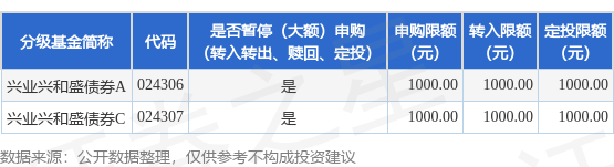 证券之星消息,12月25日兴业基金管理有限公司发布《兴业兴和盛债券型证券投资基金2026年元旦节前暂停大额申购(含转换转入和定期定额投资)公告》。公告中提示,为了保证基金的平稳运作,保护现有基金份额持有人利益,自2025年12月30日起兴业兴和盛债券型证券投资基金2026年元旦节前暂停大额申购(含转换转入和定期定额投资),申购、转换转入、定投上限金额为0.1万元,下属分级基金调整明细如下: