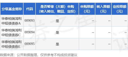 证券之星消息,12月27日华泰柏瑞基金管理有限公司发布《华泰柏瑞鸿利中短债债券型证券投资基金暂停代销机构申购和转换转入业务的公告》。公告中提示,为保证基金的平稳运作,维护基金持有人利益,自2025年12月30日起华泰柏瑞鸿利中短债债券型证券投资基金暂停代销机构申购和转换转入业务,下属分级基金调整明细如下: