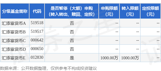 注:1、自2025年12月30日起(含2025年12月30日),汇添富货币E暂停代销渠道大额申购、大额转换转入、大额定期定额投资业务,单日单个基金账户单笔或多笔累计申购、转换转入、定期定额投资的金额不应超过10000000人民币元(含10000000人民币元)。当单日某基金账户单笔或多笔累计申购、转换转入、定期定额投资该份额的金额超过10000000人民币元,本公司将部分或全部拒绝。该份额暂停上述大额业务期间,其他业务仍照常办理。自2025年12月31日起,本基金汇添富货币E将恢复办理代销渠道大额申购、大额转换转入、大额定期定额投资业务,届时将不再另行公告。