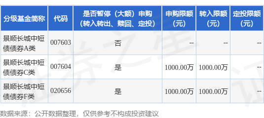 证券之星消息,12月29日景顺长城基金管理有限公司发布《关于景顺长城中短债债券型证券投资基金C类基金份额和F类基金份额限制接受壹仟万元以上申购(含日常申购和定期定额投资)及转换转入业务的公告》。公告中提示,为保护基金份额持有人利益,保障基金平稳运作,自2025年12月30日起景顺长城中短债债券型证券投资基金C类基金份额和F类基金份额限制接受壹仟万元以上申购(含日常申购和定期定额投资)及转换转入业务,申购、转换转入上限金额为1000.0万元,下属分级基金调整明细如下: